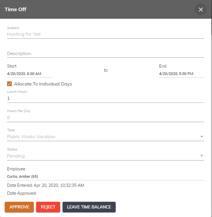 If your organization is utilizing the Time Off Request capabilities through this site, supervisors will have the ability to review these requests. The request can be approved or rejected.