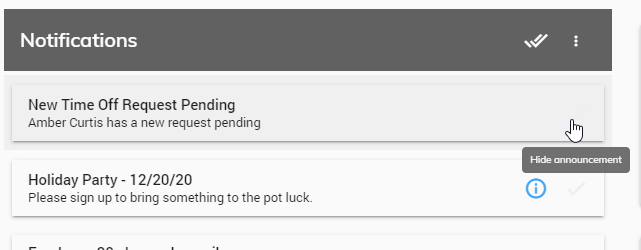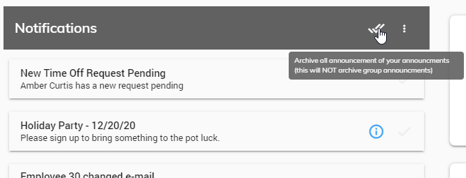To archive one notification from your list, click on the grayed out checkmark next to the announcement you intend to clear.