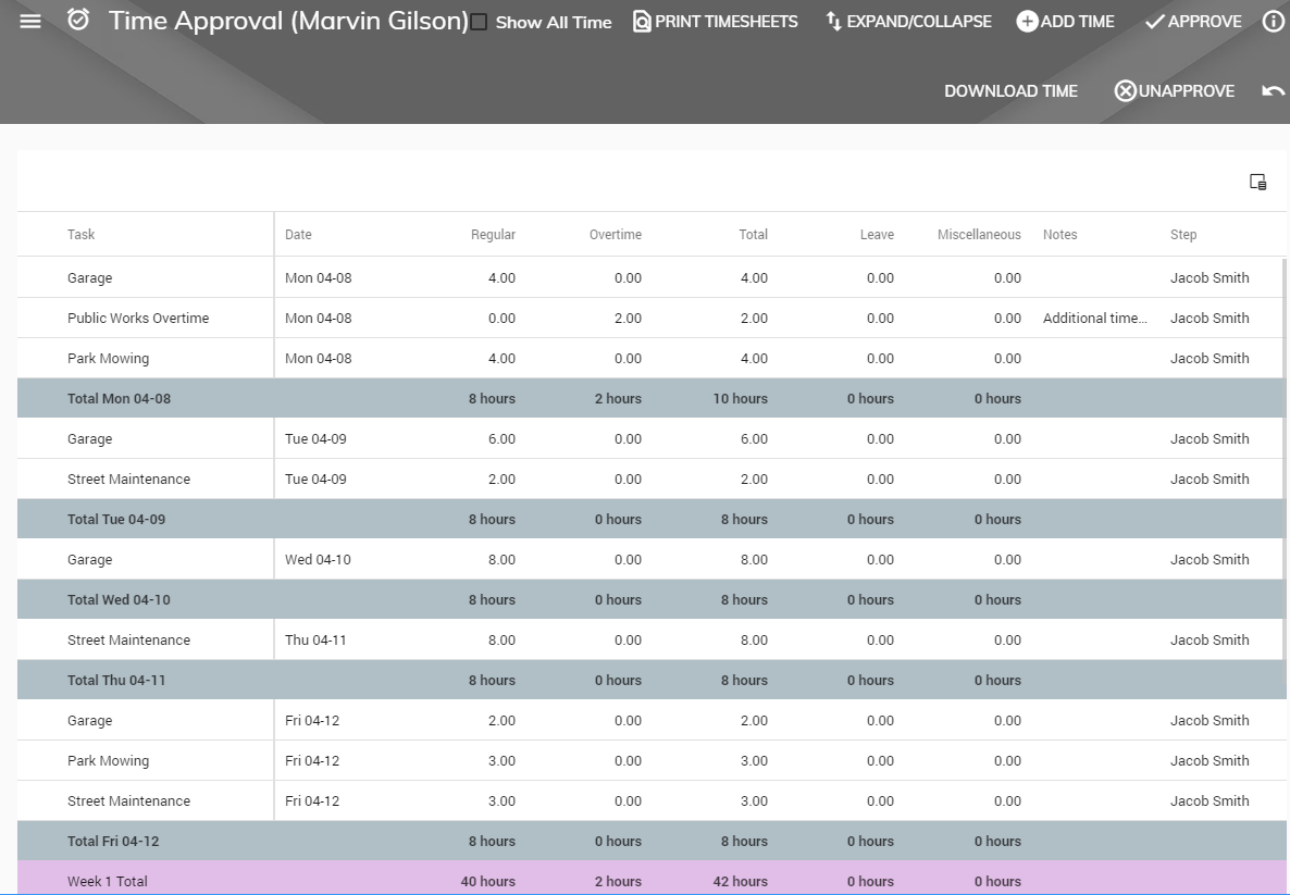That employee's unapproved time will appear showing Regular, Overtime, Leave, Total Hours, Miscellaneous, Notes, and Step.