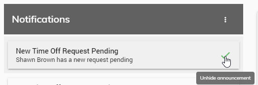 To unarchive an announcement, click the green checkmark next to any announcement. The announcement will return to being an active announcement.